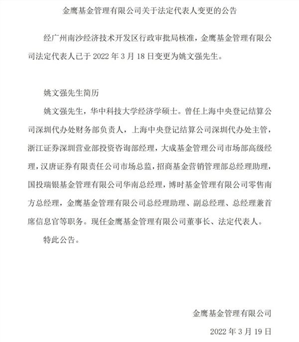 根据金鹰基金3月19日最新发布的公告,经广州南沙经济技术开发区行政审批局核准,金鹰基金管理有限公司法定代表人已于2022年3月18日变更为姚文 强先生。