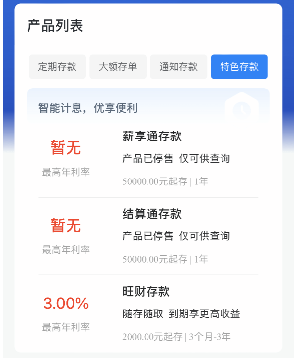 同时,建设银行特色存款列表下的“薪享通存款”、“结算通存款”产品也均已停售,目前仅可供查询。“薪享通存款”、“结算通存款”均是类智能通知存款,账户内的存款实行自动转存,灵活计息,存满7天按7天薪享通利率计息,不满7天按活期计息。