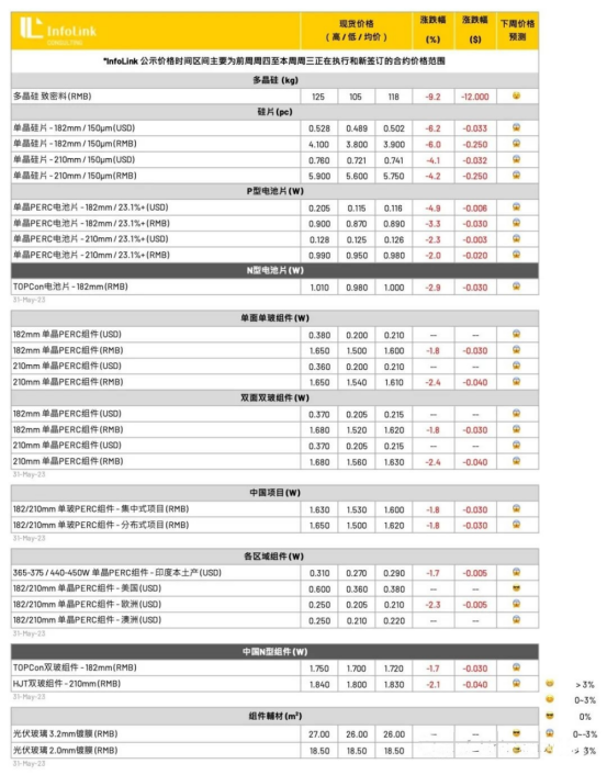 展望后势,厂家间已经陆续执行减产策略,预期实际影响将在六月中旬才会转趋明显,然而规划减产的力度并不大,甚至部分厂家希望下月排产下调后再做回升,观察六月排产与产量仍无法使硅片价格企稳着地,预期后续价格悲观看待,硅片价格仍将持续缓步下行,并视厂家间实际执行的稼动率牵动价格跌幅。