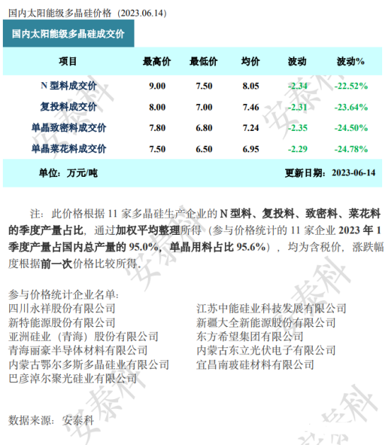 证券之星光伏行业周报:中国有色金属工业协会硅业分会数据显示,本周国内停产企业数量增加,多晶硅市场价格扩大跌幅。东吴证券最新观点指出,电镀铜产业化进程加速,助力HJT降本增效。宏观方面,国家能源局发布5月份全社会用电量等数据,5月份全社会用电量7222亿千瓦时,同比增长7.4%。国家发展改革委等部门发布《关于做好2023年降成本等重点工作的通知》,通知指出,做好能源、重要原材料保供稳价工作,继续对煤炭进口实施零关税政策。企业方面,隆基绿能宣布,经权威机构认证,隆基绿能在商业级绒面CZ硅片上实现了晶硅-钙钛矿叠层电池33.5%的转换效率,再创世界纪录。6月15日,A股新能源最大IPO华电新能源成功过会。
