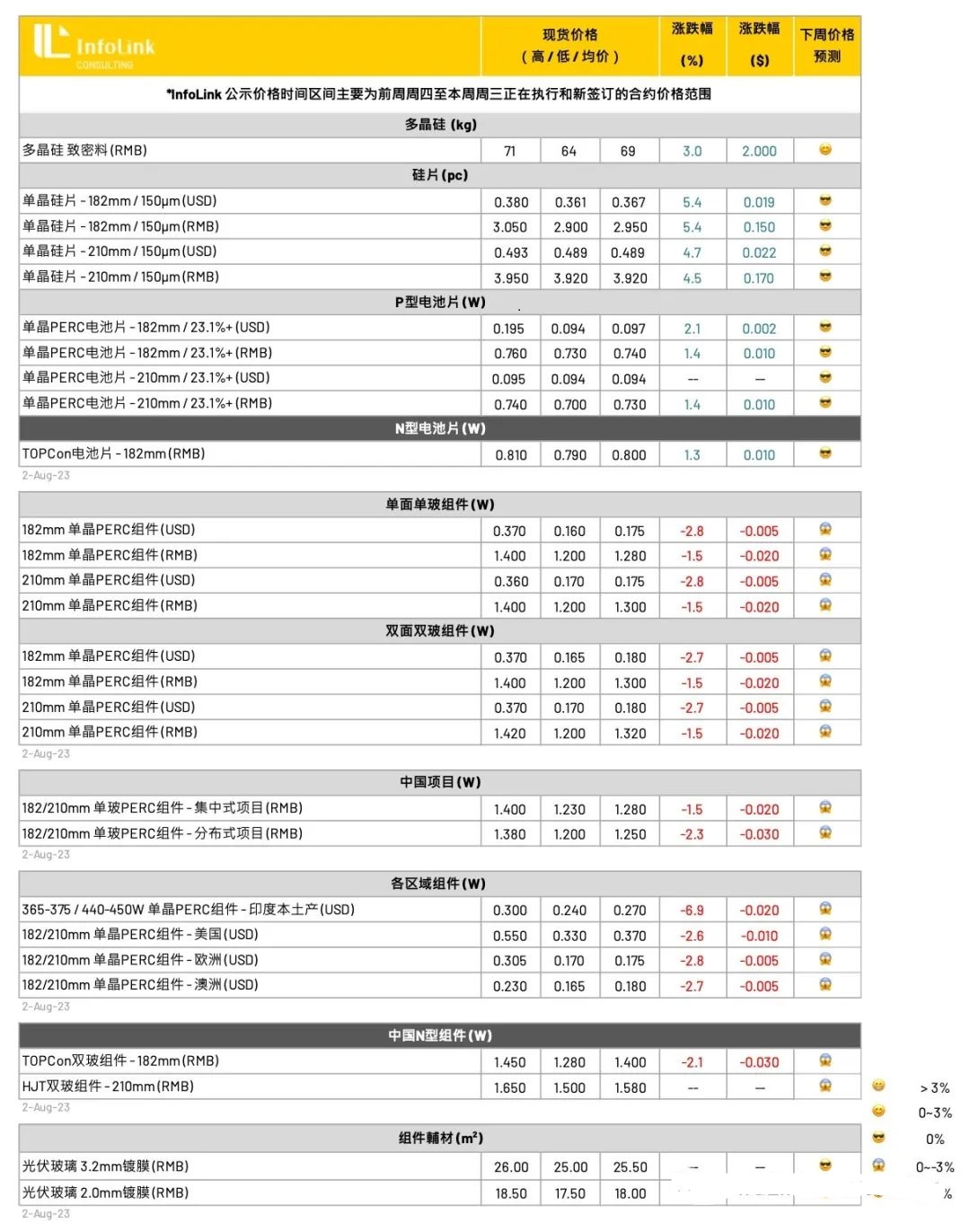 7月底硅片龙头厂家更新报价,M10尺寸新的报价上调到每片2.93-2.95元人民币之间,其余硅片厂家也随后陆续上调价格,本周主流成交价格出现上行,P型硅片中M10与G12尺寸落在每片2.95元与每片3.92元人民币左右,同比上周涨幅约4-6%不等。N型硅片部分,本周主流成交价格也对应上升到每片3.05元人民币。