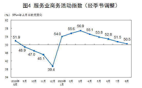 8月份,非制造业商务活动指数为51.0%,比上月下降0.5个百分点,仍高于临界点,非制造业持续扩张。