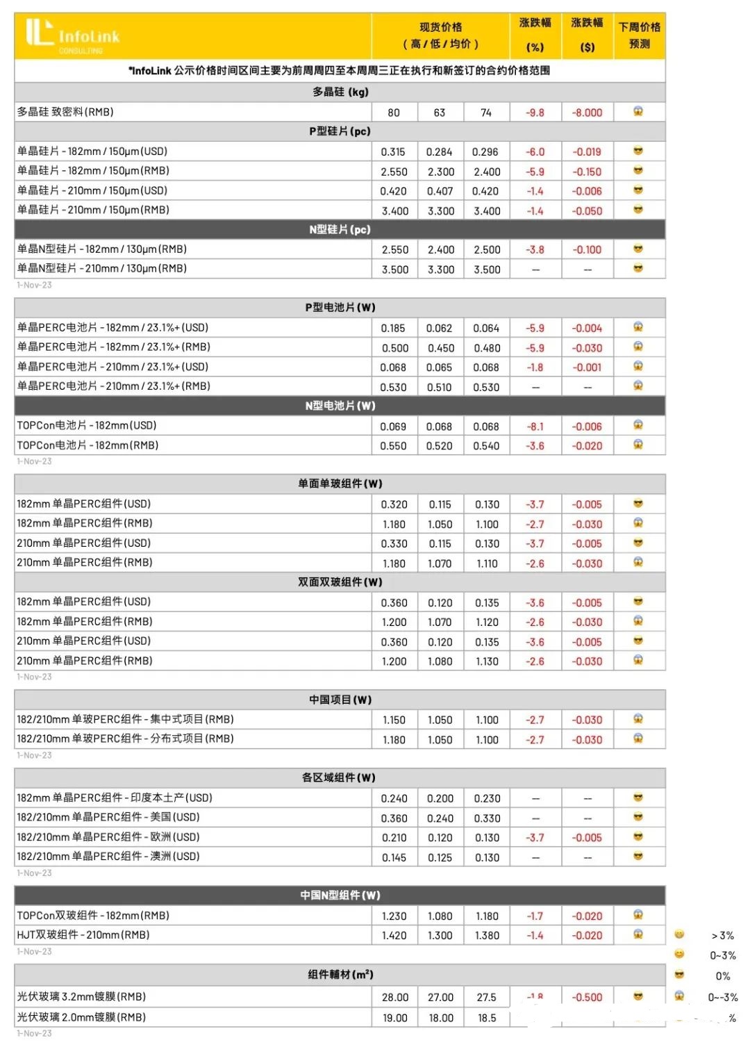 海外价格也将持续受到冲击,本周调整11月价格,11月中国出口执行价格约每瓦0.12-0.135元美金(FOB),亚太地区执行价格约0.12-0.13元美金。印度本地组件平均价格约每瓦0.2-0.24元美金。欧洲近期现货价格约在每瓦0.11-0.135欧元,价格有开始趋稳的迹象。值得注意海外需求询单已开始转换,明年厂家下半年报价PERC者较少。
