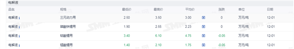 证券之星新能源车行业周报:据上海有色网,截止12月1日,电池级碳酸锂12.50-13.50万元/吨,均价13.00万元/吨,环比上一工作日下滑0.10万元/吨;工业级碳酸锂11.30-12.40万元/吨,均价11.85万元/吨,环比上一工作日下滑0.20万元/吨。供应端,近期部分上游大厂开始逐步放出前期储备库存,锂盐市场流通有所增量,但当前下游采买需求依旧疲软,供强需弱之下,市场看跌情绪依旧浓重,价格承压下行。