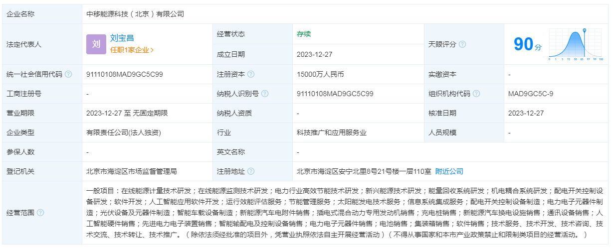 12月27日,中移能源科技(北京)有限公司注册成立,注册资本1.5亿元,法定代表人为刘宝昌。股权全景穿透图显示,该公司由中国移动设计院全资持股,后者为中国移动全资子公司。