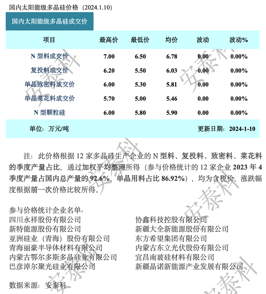 截至本周,国内多晶硅生产企业共计17家。本周暂无新增停产检修情况,企业维持正常生产,但新增产能释放不及预期,预计2024年1月份多晶硅产量增幅有限,约为17万吨。综上,预计短期内多晶硅价格有望止跌企稳,中长期价格走势还应密切关注下游开工情况。