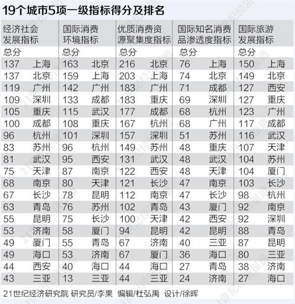 在评价体系上,21世纪经济研究院设立了5个一级指标:经济社会发展指标、国际消费环境指标、优质消费资源聚集度指标、国际知名消费品渗透度指标、国际旅游发展指标。5个一级指标之下,又设立了41个二级指标和55个三级指标,希望能更全面准确地反映上述城市的国际消费发展情况。