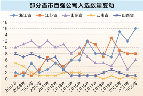 和2007年相比,云南入选公司数量从5家降至近年来仅有1家或2家入选,在资本市场的影响力日渐式微。2020年、2021年、2022年云南IPO公司数量分别为2家、2家和1家,上市公司总数仅有41家,在西部省市中处于中游水平。另一个资源大省山西入围百强的数量也从8家降至1-2家,近年来国内经济从规模优势向质量优势转变,传统煤炭行业上市公司增长乏力,战略新兴产业匮乏是其表现较弱的主要原因。