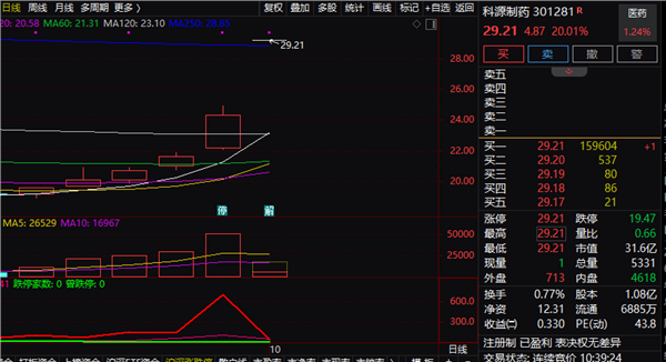 行情数据显示,科源制药今天开盘便“20cm”涨停,此后一直封住涨停。