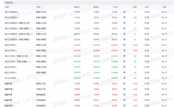 正极材料价格