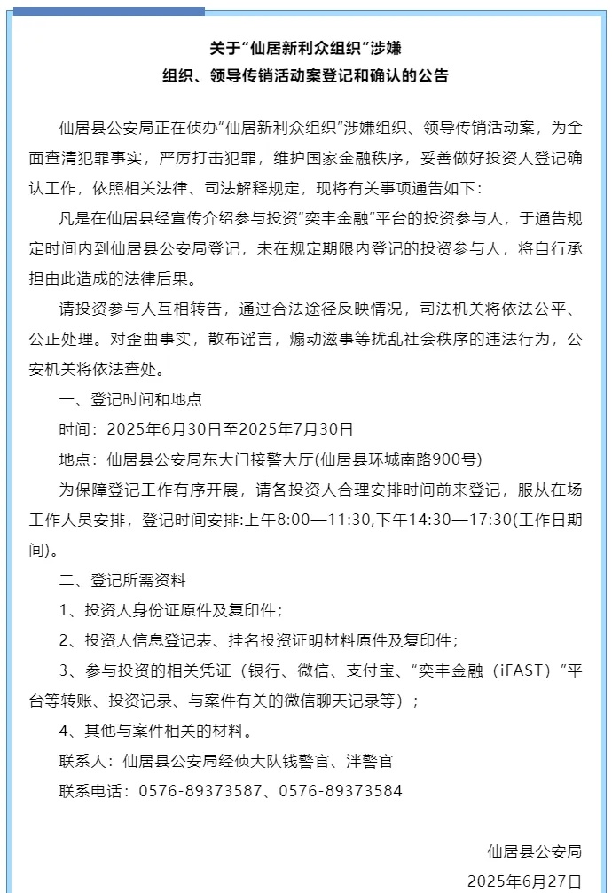 凡是在仙居县经宣传介绍参与投资“奕丰金融”平台的投资参与人,于通告规定时间内到仙居县公安局登记,未在规定期限内登记的投资参与人,将自行承担由此造成的法律后果。