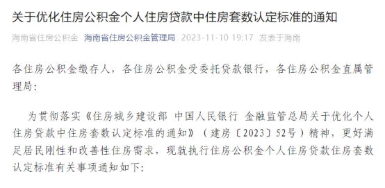 11月10日,海南省住房公积金管理局发布《关于优化住房公积金个人住房贷款中住房套数认定标准的通知》。
