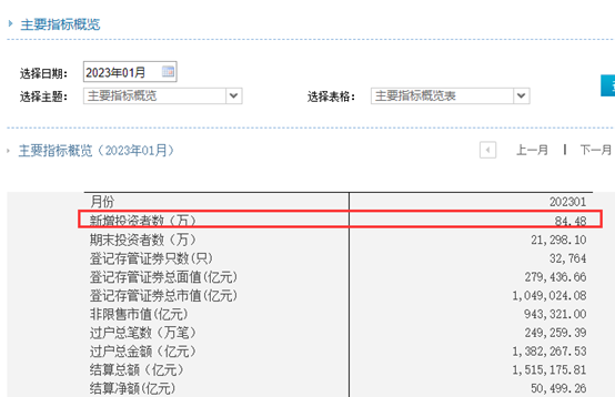 根据中国结算披露的数据,2023年1月,新增投资者数达84.48万,期末投资者数达21,298.10万(即2.1298亿)。