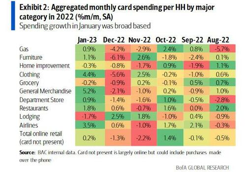 根据美国银行分析师Aditya Bhave最新公布的报告,美银统计发现,平均每个家庭的信用卡和借记卡消费总额1月份同比增长了5.1% ,创下了2022年夏季以来的最大同比增速。