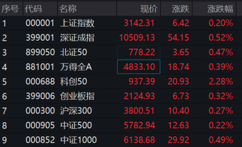 8月30日开盘,大A股主要指数全线飘红:上证指数涨0.27%,深证成指涨0.22%,创业板指涨0.21%。上午市场震荡走高后回落,截至发稿各指数涨幅略有扩大;科创50盘中一度涨超3.7%。