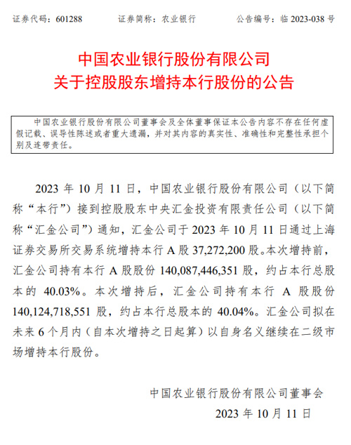 10ÔÂ11ÈÕÍí¼ä£¬Å©ÒµÒøÐз¢²¼¹ØÓڿعɹɶ«Ôö³Ö±¾ÐйɷݵĹ«¸æ³Æ£¬¿Ø¹É¹É¶«»ã½ð¹«Ë¾ÓÚ10ÔÂ11ÈÕͨ¹ýÉϺ£Ö¤È¯½»Ò×Ëù½»Ò×ϵͳÔö³Ö±¾ÐÐA¹É3727.22Íò¹É£»»ã½ð¹«Ë¾ÄâÔÚδÀ´6¸öÔÂÄÚ(×Ô±¾´ÎÔö³ÖÖ®ÈÕÆðËã)ÒÔ×ÔÉíÃûÒå¼ÌÐøÔÚ¶þ¼¶Êг¡Ôö³Ö±¾Ðйɷݡ£