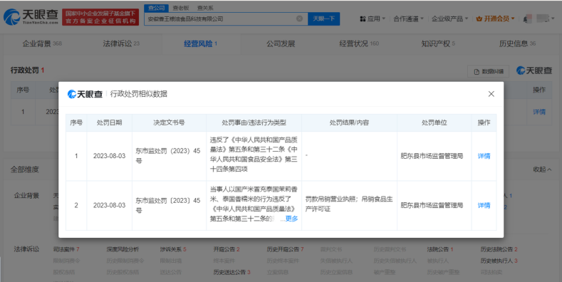 ÎÞ¶ÀÓÐż£¬±»ÆØ¹âµÄ°²»ÕºÏ·ÊÊÐÏãÍõÁ¸ÓÍʳƷ¿Æ¼¼ÓÐÏÞ¹«Ë¾Êܵ½Á˸üÑÏÀ÷µÄ´¦·£¡£ÌìÑÛ²é¾Óª·çÏÕÐÅÏ¢ÏÔʾ£¬2023Äê8Ô£¬·Ê¶«ÏØÊг¡¼à¶½¹ÜÀí¾Ö¶Ô°²»ÕºÏ·ÊÊÐÏãÍõÁ¸ÓÍʳƷ¿Æ¼¼ÓÐÏÞ¹«Ë¾×ö³ö“·£¿î¡¢µõÏúÓªÒµÖ´ÕÕ£»µõÏúʳƷÉú²úÐí¿ÉÖ¤”µÄÐÐÕþ´¦·£¡£ÒòΪÌí¼ÓÏ㾫£¬Î±Ôì“Ì©¹úÏãÃ×”£¬Ò»·½ÃæÉæ¼°³¬·¶Î§¡¢³¬ÏÞÁ¿Ê¹ÓÃʳƷÌí¼Ó¼Á£¬ÁíÒ»·½ÃæÉæ¼°Éú²úÏúÊÛÒÔ¼Ù³äÕæµÄ²úÆ·£¬ÆäÇé½ÚÏà½ÏÓÚÉÏÊö¹«Ë¾¸üΪ¶ñÁÓ¡£
