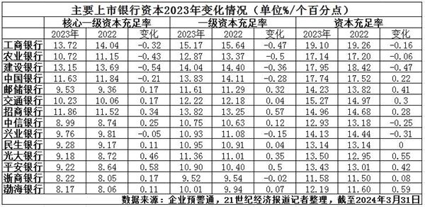 截至2024年3月底,有14家主要(大行、股份行)上市银行披露了其2023年财报,据21世纪经济报道记者梳理发现,2023年除四大行、兴业银行外,其他多数银行的资本指标都有所增长,仅个别出现了下降。如,浙商银行一级资本充足率下降0.02个百分点,中信银行资本充足率下降0.25个百分点。