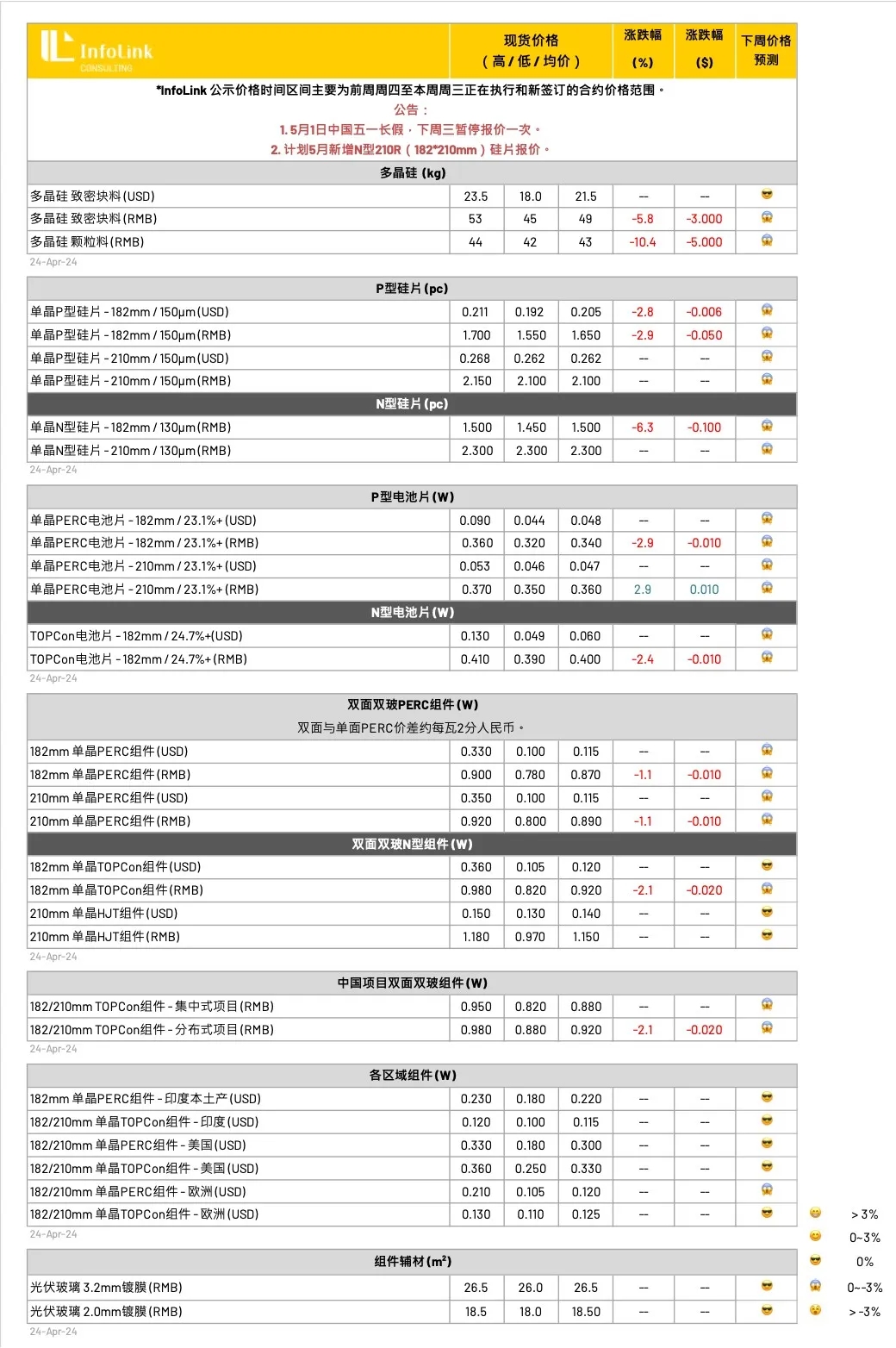 四月即将收尾,面临中国五一假期之前所剩无几的工作日,硅料价格继续下跌虽然仍存在可能,但是跌幅和跌速将在二季度中后期明显收窄和放缓。另外现已跌破整体生产成本水平,如前所述,继续超跌可能性存在,但是空间已然有限。二季度后期需要重点关注企业开工和产线关停动向。