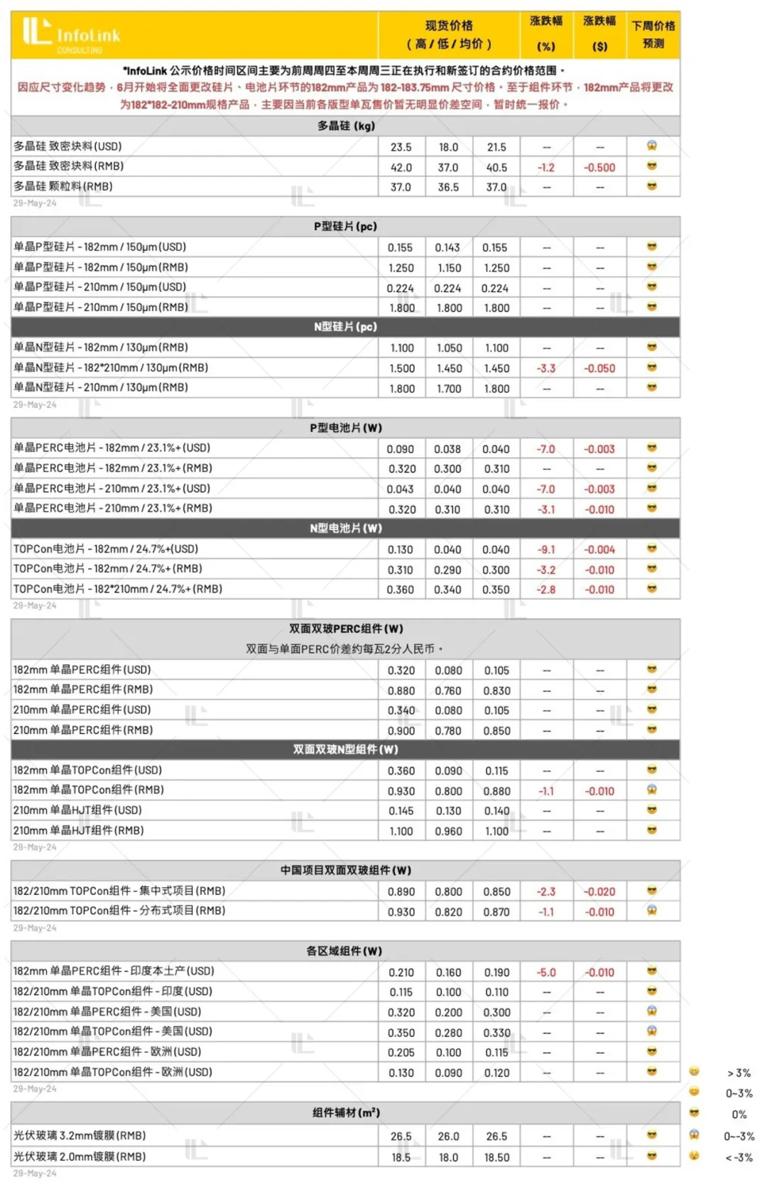 硅料环节市场情况仍然复杂,连续数周下跌的硅料价格已经完全击破行业整体包括一线企业的现金成本水平,五月下旬随着越来越多企业开始通过检修和减产的方式调整产出量和库存水位,本期价格趋势逐渐反应整体价格下跌乏力迹象。