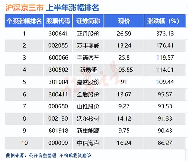 在上半年的涨幅榜单中,正丹股份、万丰奥威、宇通客车、新易盛、嘉益股份、金盾股份、山推股份、沃尔核材、新集能源、中信海直等个股脱颖而出,位列前十。其中,正丹股份(300641.SZ)以惊人的373.13%涨幅荣登A股市场“上半年王者”宝座。自今年2月7日触及2.81元/股的历史低点后,其股价一路飙升,至6月中旬累计涨幅高达767.52%,因此被市场誉为“超级丹”。