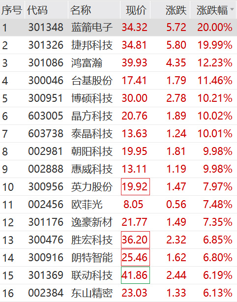 个股方面,捷邦科技20CM涨停,晶方科技、惠威科技、朝阳科技等多股涨停,鸿富瀚涨超10%。