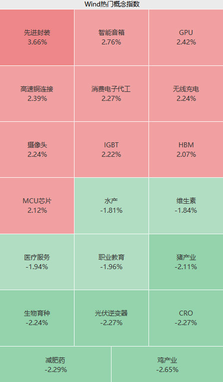 盘面上,上午消费电子、半导体、通信设备、贵金属等板块存在局部行情,智能音箱、摄像头、先进封装等板块活跃;建材、教育、农业等板块下挫,CRO、光伏逆变器、减肥药、鸡产业等概念跌幅居前。