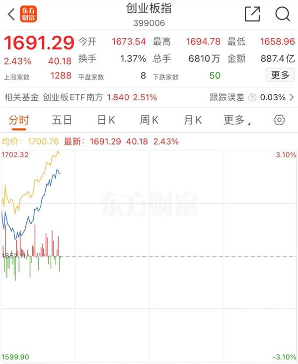 7月11日,A股开盘,三大指数全线高开高走,截至发稿,沪指涨0.84%,深成指涨2%,创业板指大涨超2.4%,沪深北三市近5000只个股录得上涨。