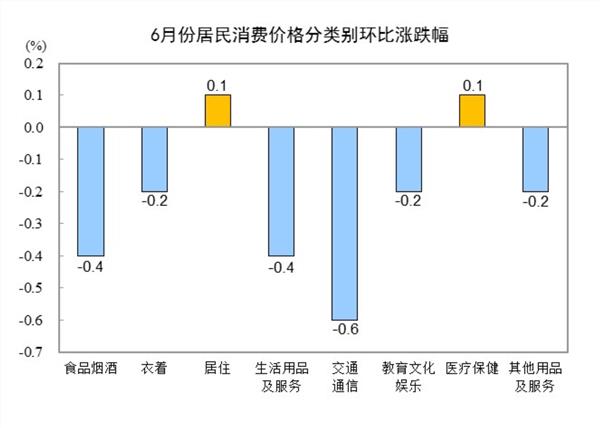 其他七大类价格环比两涨五降。其中,居住、医疗保健价格均上涨0.1%;交通通信、生活用品及服务价格分别下降0.6%和0.4%,衣着、教育文化娱乐、其他用品及服务价格均下降0.2%。