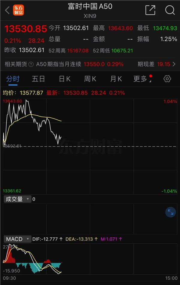 富时中国A50指数期货盘中大涨超1%,截至发稿,涨幅有所回落。