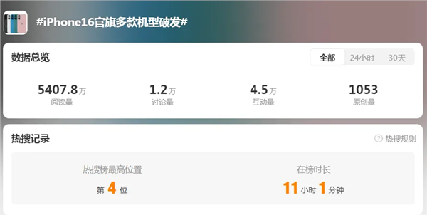 10月21日,#iPhone16官旗多款机型破发#冲上热搜。在2024年“双11”电商节中,苹果发布仅1个月的iPhone 16系列全系迎来降价,这是新机发布以来官方渠道首次降价。