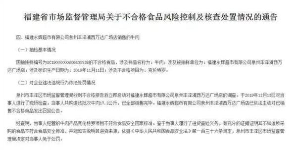 除上述内容外,福建省市场监督管理局网站于6月9日公布的《福建省市场监督管理局关于不合格食品风险控制及核查处置情况的通告》显示,福建永辉超市有限公司泉州丰泽浦西万达广场店销售的牛肉抽查不合格。泉州市丰泽区市场监督管理局于2019年12月13日对福建永辉超市有限公司泉州丰泽浦西万达广场店进行了现场检查,该店共购进该批次牛肉17.2公斤,已全部销售完毕。福建永辉超市有限公司泉州丰泽浦西万达广场店已依法主动对已销售不合格食品发出召回公告。