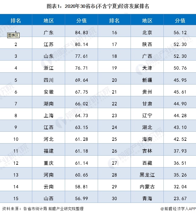 2020年各省市经济发展排名具体如下: